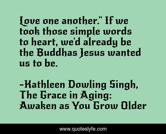 This page presents the quote "Love one another." If we took those simple words to heart, we'd already be the Buddhas Jesus wanted us to be.". Author of this quote is Kathleen Dowling Singh, The Grace in Aging: Awaken as You Grow Older. This quote is about spirituality, buddha, jesus,.