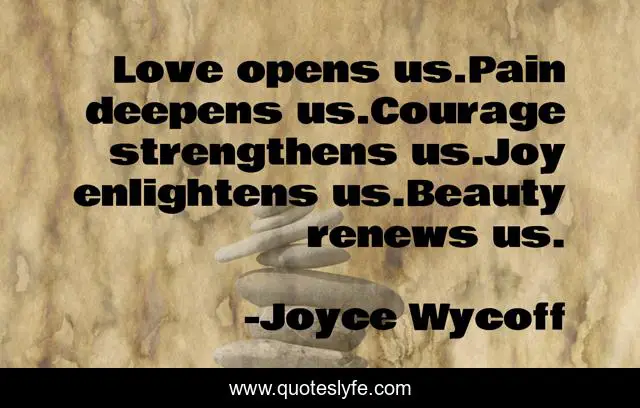 This page presents the quote "Love opens us.Pain deepens us.Courage strengthens us.Joy enlightens us.Beauty renews us.". Author of this quote is Joyce Wycoff. This quote is about love, beauty, joy, courage, pain, affection,.