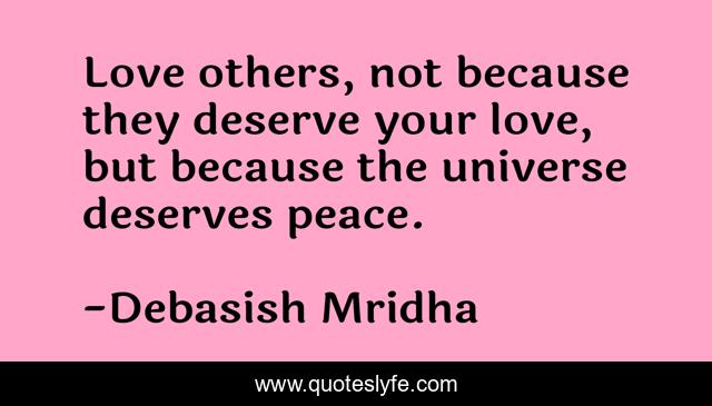 This page presents the quote "Love others, not because they deserve your love, but because the universe deserves peace.". Author of this quote is Debasish Mridha. This quote is about life, love, knowledge, inspirational, intelligence, philosophy, wisdom, quotes, affection,.