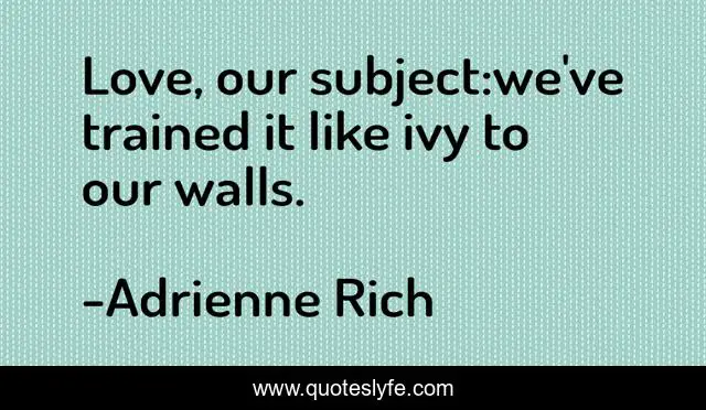 This page presents the quote "Love, our subject:we've trained it like ivy to our walls.". Author of this quote is Adrienne Rich. .