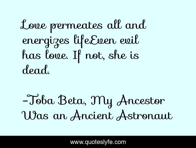 This page presents the quote "Love permeates all and energizes life.Even evil has love. If not, she is dead.". Author of this quote is Toba Beta, My Ancestor Was an Ancient Astronaut. This quote is about evil, energy, love, live, affection,.