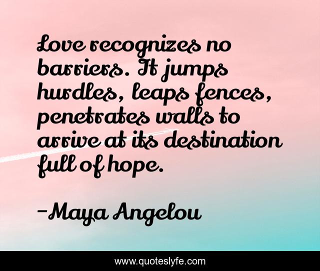 This page presents the quote "Love recognizes no barriers. It jumps hurdles, leaps fences, penetrates walls to arrive at its destination full of hope.". Author of this quote is Maya Angelou. This quote is about love, affection,.