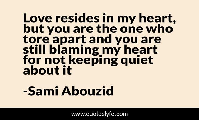 This page presents the quote "Love resides in my heart, but you are the one who tore apart and you are still blaming my heart for not keeping quiet about it". Author of this quote is Sami Abouzid. This quote is about love, affection,.