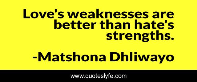 "Matshona Dhliwayo Quotes." Quoteslyfe.com, 2025. Fri. 05 Dec. 2025. <https://www.quoteslyfe.com/quote/Love-s-weaknesses-are-better-than-hate-121081>.
