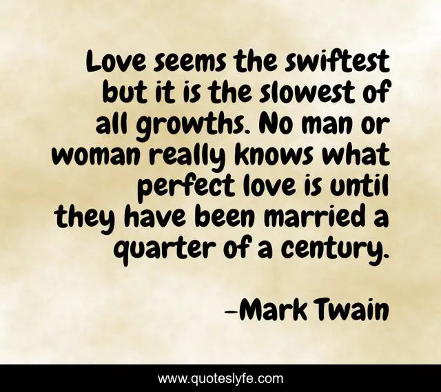This page presents the quote "Love seems the swiftest but it is the slowest of all growths. No man or woman really knows what perfect love is until they have been married a quarter of a century.". Author of this quote is Mark Twain. .