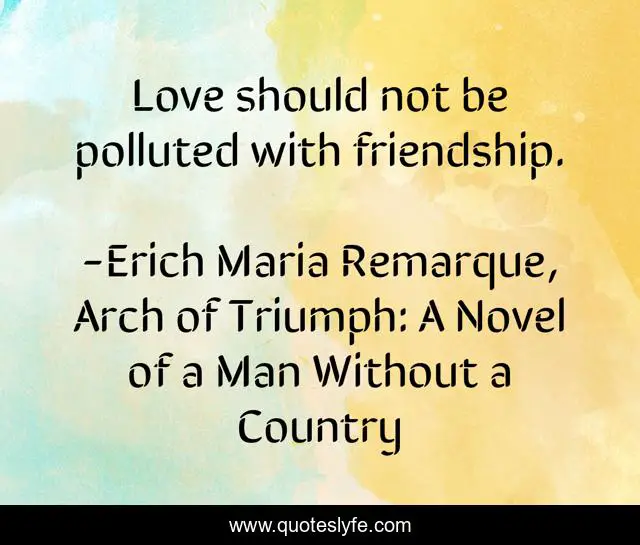 This page presents the quote "Love should not be polluted with friendship.". Author of this quote is Erich Maria Remarque, Arch of Triumph: A Novel of a Man Without a Country. This quote is about friendship, love, relationship, affection,.