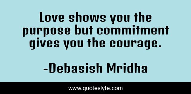 This page presents the quote "Love shows you the purpose but commitment gives you the courage.". Author of this quote is Debasish Mridha. This quote is about life, love, knowledge, inspirational, intelligence, philosophy, wisdom, quotes, affection,.