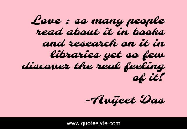 This page presents the quote "Love : so many people read about it in books and research on it in libraries yet so few discover the real feeling of it!". Author of this quote is Avijeet Das. This quote is about love, valentines, discover, research, libraries, books, affection,.