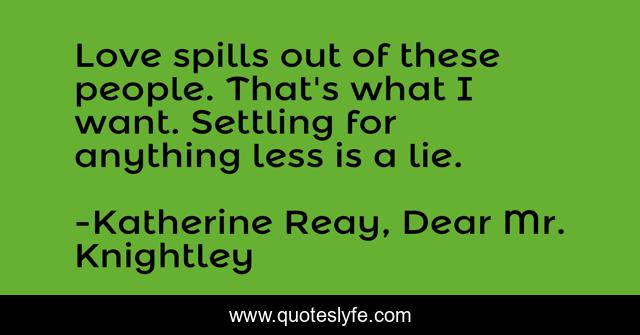 This page presents the quote "Love spills out of these people. That's what I want. Settling for anything less is a lie.". Author of this quote is Katherine Reay, Dear Mr. Knightley. This quote is about settling, lie, love, loving-someone, lying-lying-to-yourself, affection, loving,.