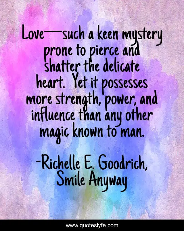 This page presents the quote "Love—such a keen mystery prone to pierce and shatter the delicate heart. Yet it possesses more strength, power, and influence than any other magic known to man.". Author of this quote is Richelle E. Goodrich, Smile Anyway. This quote is about magic, heartbreak, richelle, richelle-goodrich, love, affection,.