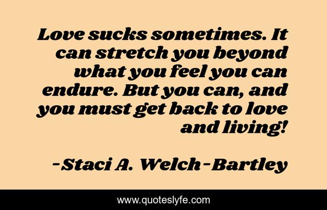 This page presents the quote "Love sucks sometimes. It can stretch you beyond what you feel you can endure. But you can, and you must get back to love and living!". Author of this quote is Staci A. Welch-Bartley. This quote is about relationships, breakups, advice, love, affection,.
