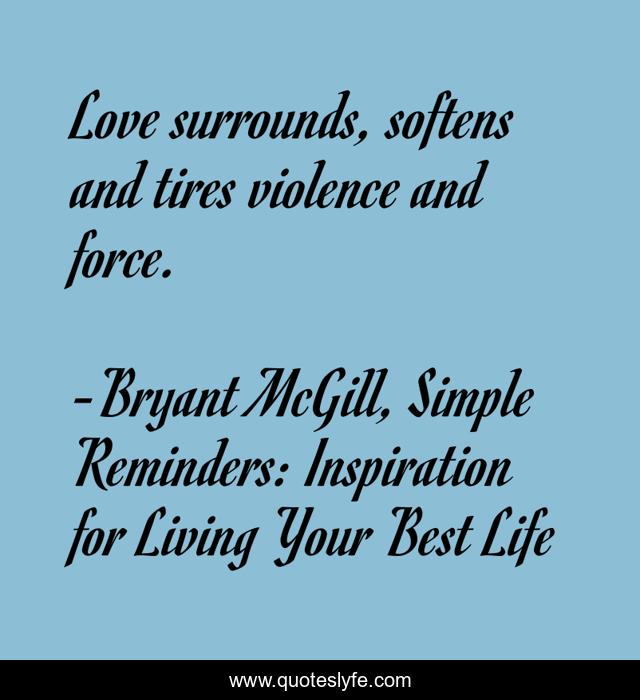 This page presents the quote "Love surrounds, softens and tires violence and force.". Author of this quote is Bryant McGill, Simple Reminders: Inspiration for Living Your Best Life. This quote is about force, violence, surrounding, softness, love, affection,.