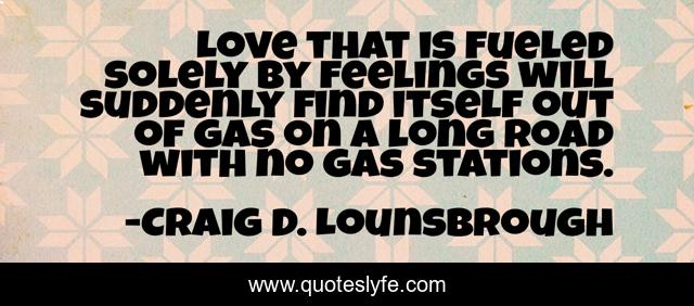 This page presents the quote "Love that is fueled solely by feelings will suddenly find itself out of gas on a long road with no gas stations.". Author of this quote is Craig D. Lounsbrough. This quote is about loved, superficial, love, shallow, gas, emotions, feelings, fueled, station,.