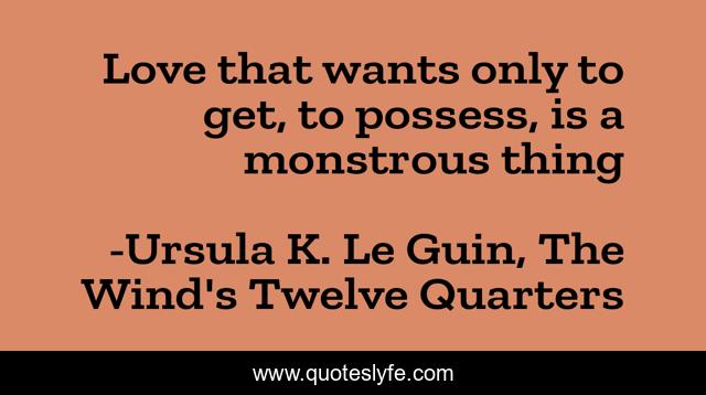 This page presents the quote "Love that wants only to get, to possess, is a monstrous thing". Author of this quote is Ursula K. Le Guin, The Wind's Twelve Quarters. This quote is about jealousy, love, ownership, affection, greed,.