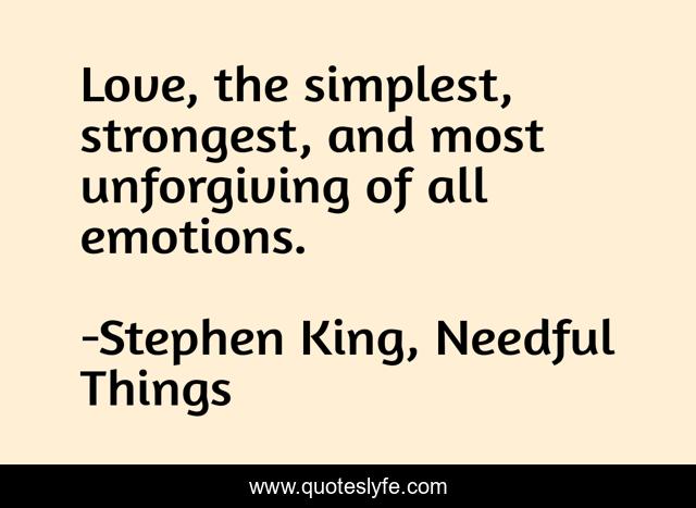 This page presents the quote "Love, the simplest, strongest, and most unforgiving of all emotions.". Author of this quote is Stephen King, Needful Things. This quote is about love, forgive, emotions, unforgiving, forgiveness, affection,.