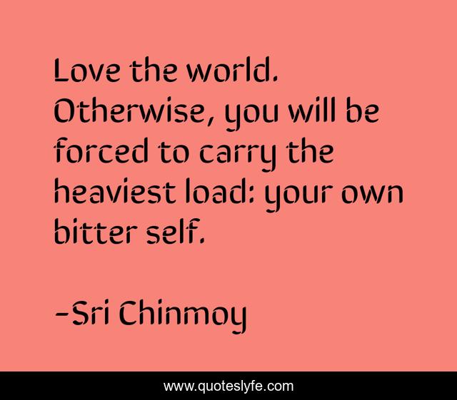 This page presents the quote "Love the world. Otherwise, you will be forced to carry the heaviest load: your own bitter self.". Author of this quote is Sri Chinmoy. This quote is about world, love, affection,.