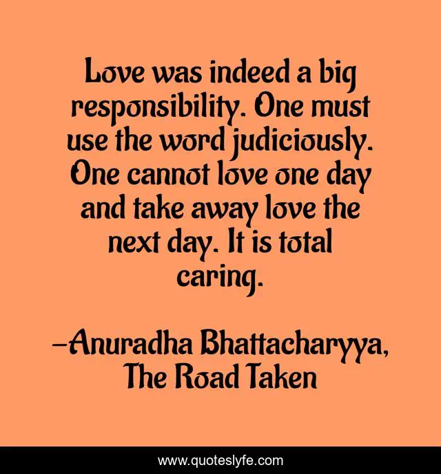 This page presents the quote "Love was indeed a big responsibility. One must use the word judiciously. One cannot love one day and take away love the next day. It is total caring.". Author of this quote is Anuradha Bhattacharyya, The Road Taken. This quote is about loss, love, lost-love, responsibility, love-story, losing-someone, affection, care,.