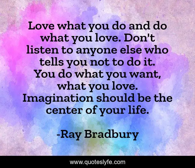 This page presents the quote "Love what you do and do what you love. Don't listen to anyone else who tells you not to do it. You do what you want, what you love. Imagination should be the center of your life.". Author of this quote is Ray Bradbury. This quote is about imagination, follow-your-dreams,.