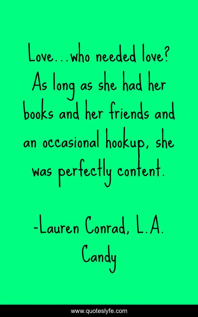 This page presents the quote "Love...who needed love? As long as she had her books and her friends and an occasional hookup, she was perfectly content.". Author of this quote is Lauren Conrad, L.A. Candy. This quote is about relationships, love, contented, single, books, friends, affection,.