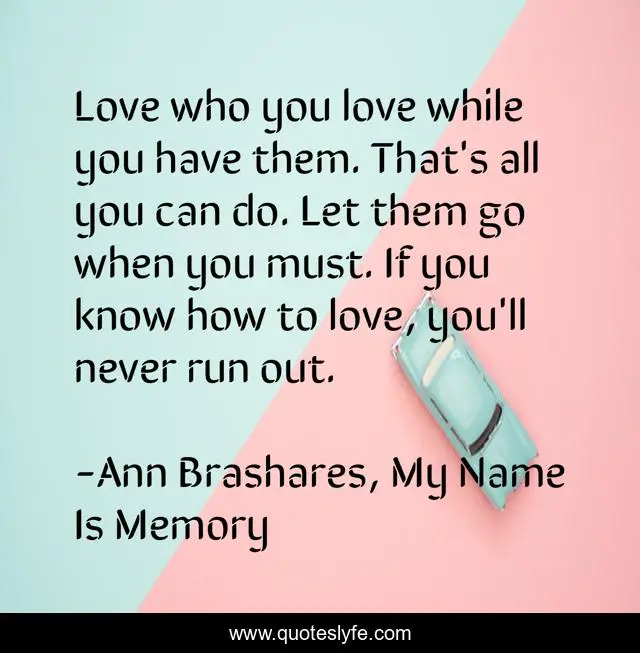 This page presents the quote "Love who you love while you have them. That's all you can do. Let them go when you must. If you know how to love, you'll never run out.". Author of this quote is Ann Brashares, My Name Is Memory. This quote is about love, affection,.
