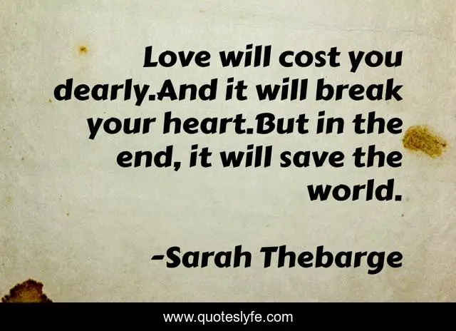 This page presents the quote "Love will cost you dearly.And it will break your heart.But in the end, it will save the world.". Author of this quote is Sarah Thebarge. This quote is about love, cancer, god, virgin-mary, hope, somalia, the-invisible-girls, chemo, refugees,.