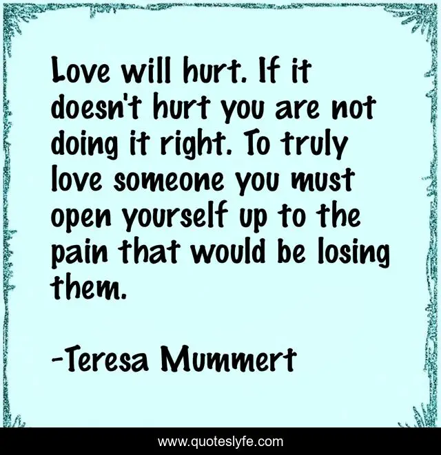 This page presents the quote "Love will hurt. If it doesn't hurt you are not doing it right. To truly love someone you must open yourself up to the pain that would be losing them.". Author of this quote is Teresa Mummert. This quote is about love-loss-relationships, advice,.