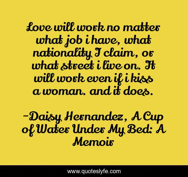 This page presents the quote "Love will work no matter what job i have, what nationality I claim, or what street i live on. It will work even if i kiss a woman. and it does.". Author of this quote is Daisy Hernandez, A Cup of Water Under My Bed: A Memoir. This quote is about love, glbt, lgbt, street, nationality, affection, women,.