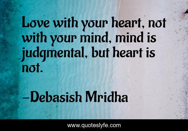 This page presents the quote "Love with your heart, not with your mind, mind is judgmental, but heart is not.". Author of this quote is Debasish Mridha. This quote is about life, love, knowledge, inspirational, intelligence, philosophy, wisdom, quotes, affection,.