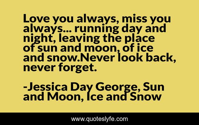 This page presents the quote "Love you always, miss you always... running day and night, leaving the place of sun and moon, of ice and snow.Never look back, never forget.". Author of this quote is Jessica Day George, Sun and Moon, Ice and Snow. This quote is about love, sun, ice, mon, never-forget, affection,.