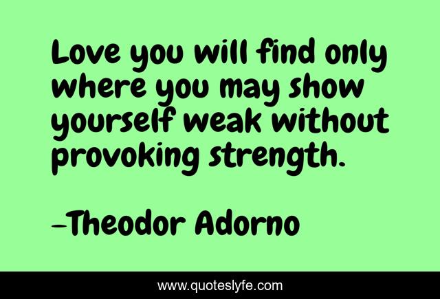 This page presents the quote "Love you will find only where you may show yourself weak without provoking strength.". Author of this quote is Theodor Adorno. This quote is about strength, yourself,.
