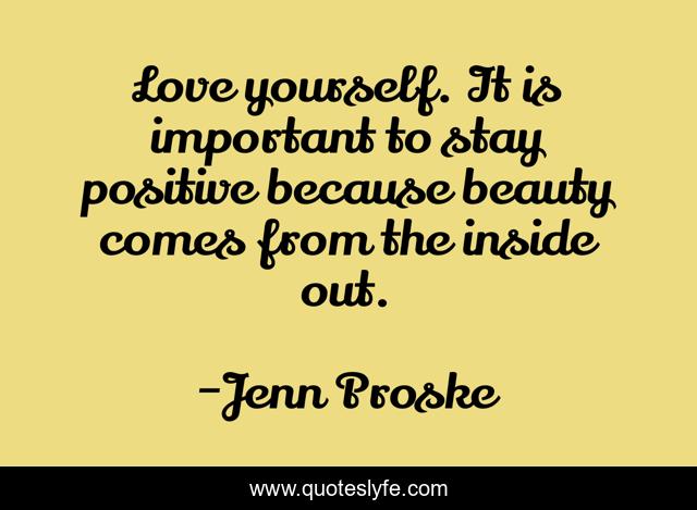 This page presents the quote "Love yourself. It is important to stay positive because beauty comes from the inside out.". Author of this quote is Jenn Proske. This quote is about positive, confidence, beauty,.