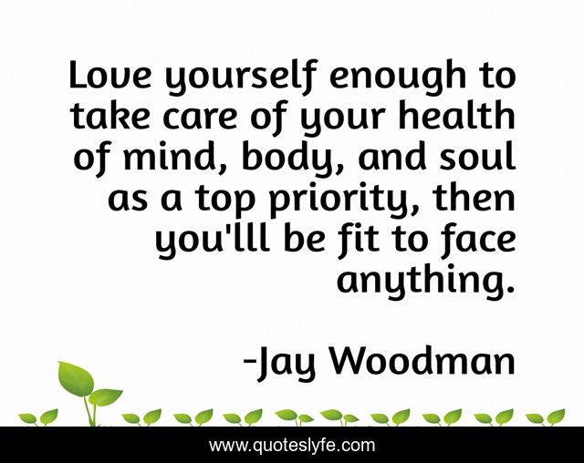 This page presents the quote "Love yourself enough to take care of your health of mind, body, and soul as a top priority, then you'lll be fit to face anything.". Author of this quote is Jay Woodman. This quote is about body, fitter-happier, love, fit, mind, soul, health, affection,.