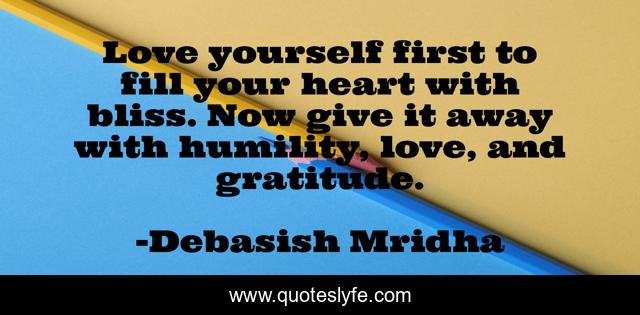 This page presents the quote "Love yourself first to fill your heart with bliss. Now give it away with humility, love, and gratitude.". Author of this quote is Debasish Mridha. This quote is about gratitude, love, life-wisdom, fill-your-heart, philosophy, debasish-mridha, love-yourself, quotes, inspirational,.