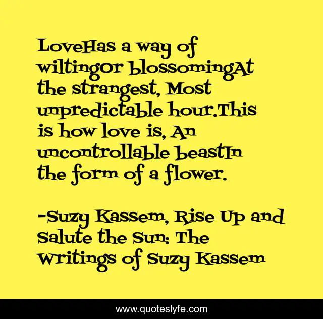 This page presents the quote "LoveHas a way of wiltingOr blossomingAt the strangest, Most unpredictable hour.This is how love is, An uncontrollable beastIn the form of a flower.". Author of this quote is Suzy Kassem, Rise Up and Salute the Sun: The Writings of Suzy Kassem. This quote is about spiritual, love, growth, relationships, poem, flower, dying, romance, strange,.