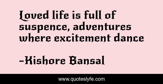 This page presents the quote "Loved life is full of suspence, adventures where excitement dance". Author of this quote is Kishore Bansal. This quote is about excitement, loved, suspense, adventure,.