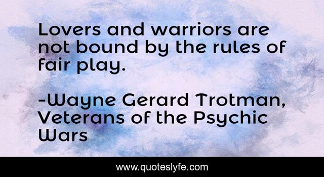 This page presents the quote "Lovers and warriors are not bound by the rules of fair play.". Author of this quote is Wayne Gerard Trotman, Veterans of the Psychic Wars. This quote is about restrictions, lovers, fair-play, warfare, rules, warriors, romance, chivalry, love,.