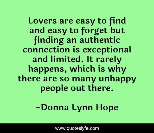 This page presents the quote "Lovers are easy to find and easy to forget but finding an authentic connection is exceptional and limited. It rarely happens, which is why there are so many unhappy people out there.". Author of this quote is Donna Lynn Hope. This quote is about connection, lovers, soulmates,.