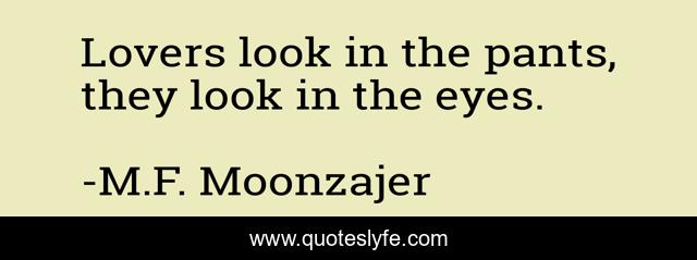 This page presents the quote "Lovers look in the pants, they look in the eyes.". Author of this quote is M.F. Moonzajer. This quote is about eyes, lovers, pants,.