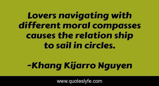 This page presents the quote "Lovers navigating with different moral compasses causes the relation ship to sail in circles.". Author of this quote is Khang Kijarro Nguyen. This quote is about circles, lovers, relationship, sail, moral-compass, relation, ship,.