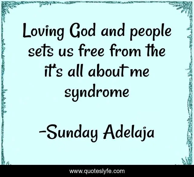 This page presents the quote "Loving God and people sets us free from the it’s all about me syndrome". Author of this quote is Sunday Adelaja. This quote is about god, free, loving,.
