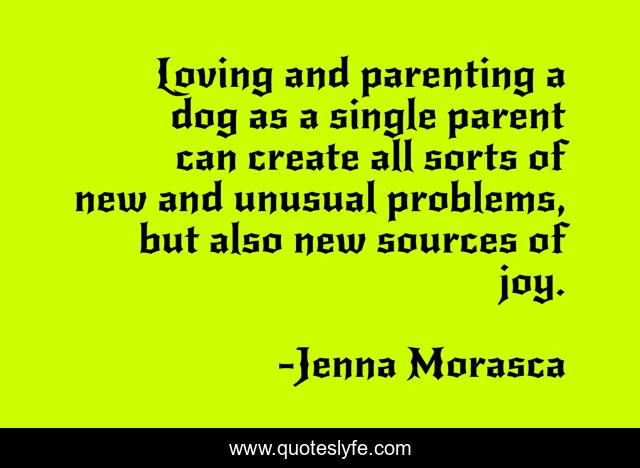 This page presents the quote "Loving and parenting a dog as a single parent can create all sorts of new and unusual problems, but also new sources of joy.". Author of this quote is Jenna Morasca. This quote is about joy, problems, dog,.