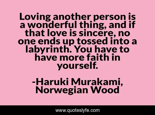 This page presents the quote "Loving another person is a wonderful thing, and if that love is sincere, no one ends up tossed into a labyrinth. You have to have more faith in yourself.". Author of this quote is Haruki Murakami, Norwegian Wood. This quote is about faith, sincerity, truth, loving,.