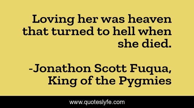 This page presents the quote "Loving her was heaven that turned to hell when she died.". Author of this quote is Jonathon Scott Fuqua, King of the Pygmies. This quote is about loss, heaven, love, heart-break, sadness, heartbreak, hell, in-love, affection,.