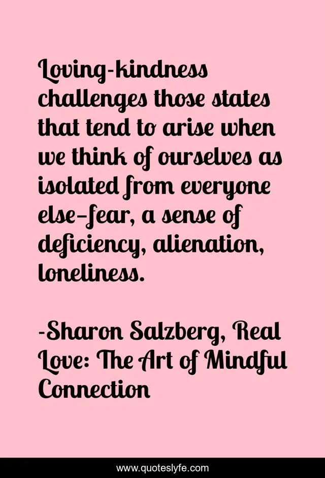 This page presents the quote "Loving-kindness challenges those states that tend to arise when we think of ourselves as isolated from everyone else—fear, a sense of deficiency, alienation, loneliness.". Author of this quote is Sharon Salzberg, Real Love: The Art of Mindful Connection. This quote is about loneliness, love, self-improvement, affection,.
