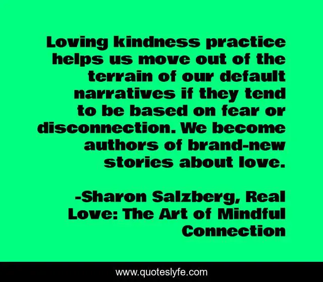 This page presents the quote "Loving kindness practice helps us move out of the terrain of our default narratives if they tend to be based on fear or disconnection. We become authors of brand-new stories about love.". Author of this quote is Sharon Salzberg, Real Love: The Art of Mindful Connection. This quote is about meditation, love, affection, mindfulness,.
