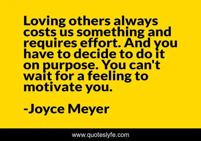 This page presents the quote "Loving others always costs us something and requires effort. And you have to decide to do it on purpose. You can't wait for a feeling to motivate you.". Author of this quote is Joyce Meyer. This quote is about effort, purpose, loving,.