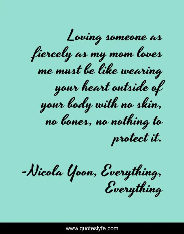 This page presents the quote "Loving someone as fiercely as my mom loves me must be like wearing your heart outside of your body with no skin, no bones, no nothing to protect it.". Author of this quote is Nicola Yoon, Everything, Everything. This quote is about motherhood, love, affection,.