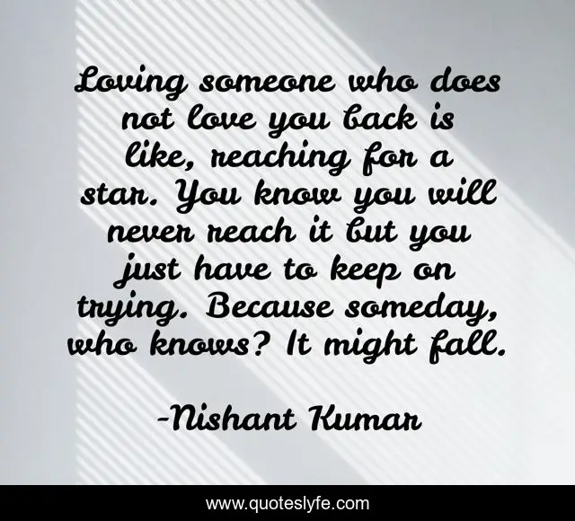 This page presents the quote "Loving someone who does not love you back is like, reaching for a star. You know you will never reach it but you just have to keep on trying. Because someday, who knows? It might fall.". Author of this quote is Nishant Kumar. This quote is about love, affection,.