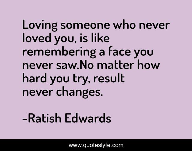 This page presents the quote "Loving someone who never loved you, is like remembering a face you never saw.No matter how hard you try, result never changes.". Author of this quote is Ratish Edwards. This quote is about faces, love, from-the-book-of-edward, affection, people,.