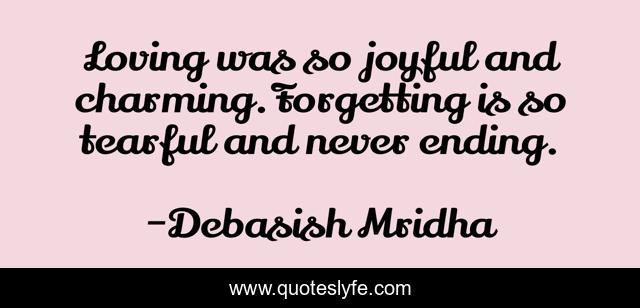 This page presents the quote "Loving was so joyful and charming.Forgetting is so tearful and never ending.". Author of this quote is Debasish Mridha. This quote is about life, love, knowledge, inspirational, intelligence, philosophy, wisdom, quotes, affection,.
